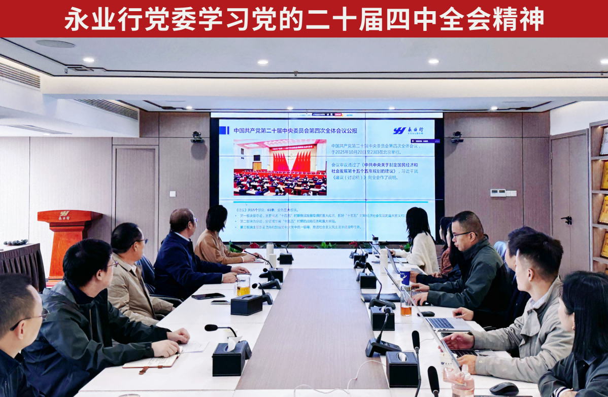 此次专题学习是永业行党委贯彻落实党的二十届四中全会精神的重要举措。永业行将以此次全会精神为指引,持续推动全会精神落地生根,以实干实绩书写新时代高质量发展答卷,为服务国家战略与地方发展贡献专业力量。